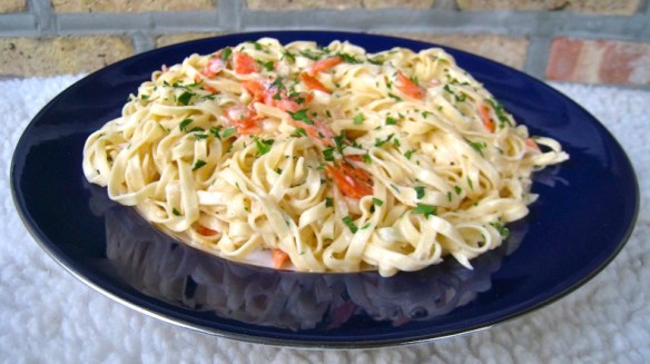 I can see now that my early renditions were doomed to failure. I used too much cream, not enough salmon, and the technique was all wrong. Even my use of garlic proved to be too much for the dish. In the end, however, I did wind up with a tasty cream sauce similar to the recipe that I’ve already shared for fettuccine alfredo. Being