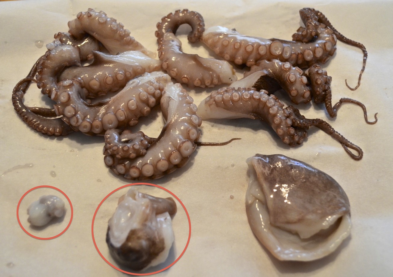 _DSC0124 copy Published October 15, 2013 at 1306 × 922 in This Recipe has Legs: Strangozzi Pasta with Octopus Cleaned and cut. Smaller circled item is the beak; the larger is the eyes