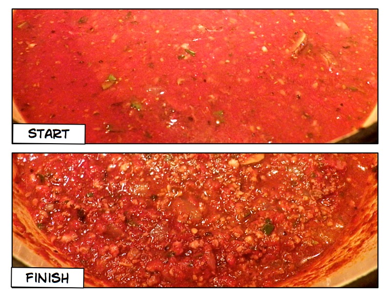 - The pasta should be nearing completion. Add the tomatoes to the frying pan. Raise the heat to med-high.