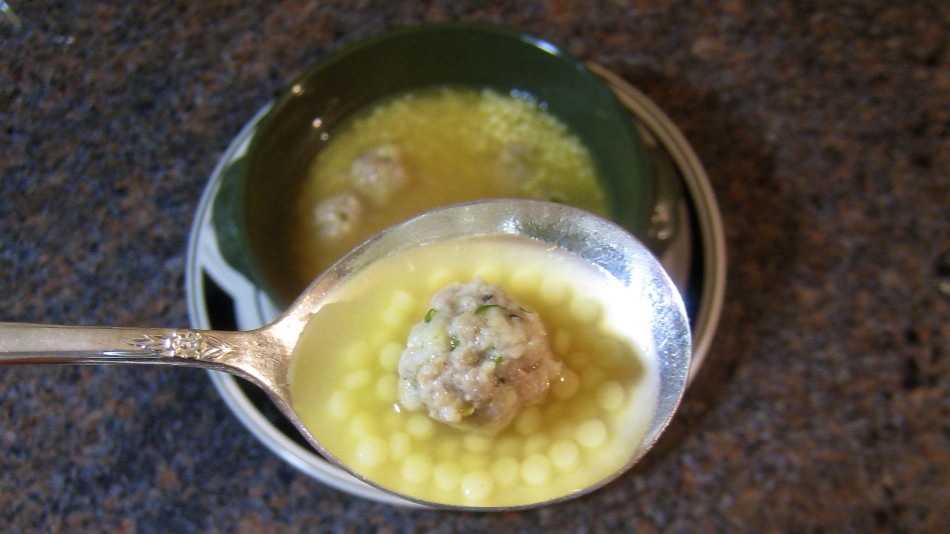 Soup made with Acini di Pepe is not a Bartolini tradition. Oh, sure, it was served plenty of times at the old two-flat but it wasn’t made from a recipe that had been handed down from one generation to the next. It came to us, oddly enough, from the Mother of my 5th grade teacher. Mr. D was from Upstate New York and my class was his first in Detroit. In fact, he arrived in my hometown barely 1 week before school started that September. Mr. D wanted to introduce himself to the parish and to our parents so, once classes started, he visited the home of each of his students. He chose the families alphabetically, making mine the second home he entered. And as was so often the case with newcomers who entered the two-flat, he hung around for a number of years — make that decades — afterwards. (There was a similar phenomenon in our backyard that involved Grandpa, our neighbors, and the Parish priests but I’ll save that for another post.) Eventually, Mr. D migrated upstairs, becoming good friends of Zia and Uncle. At some point, and I do not recall how much time had transpired, his Mother and Aunt came to Detroit for a visit. It wasn’t long before they, too, became ensnared in the two-flat’s web of conviviality. Well, as luck would have it, both women were good cooks and during subsequent visits, recipes were traded. One of the very few recipes to survive is today’s minestra, Acini di Pepe with meatballs. (It took a while but I got us here.)
