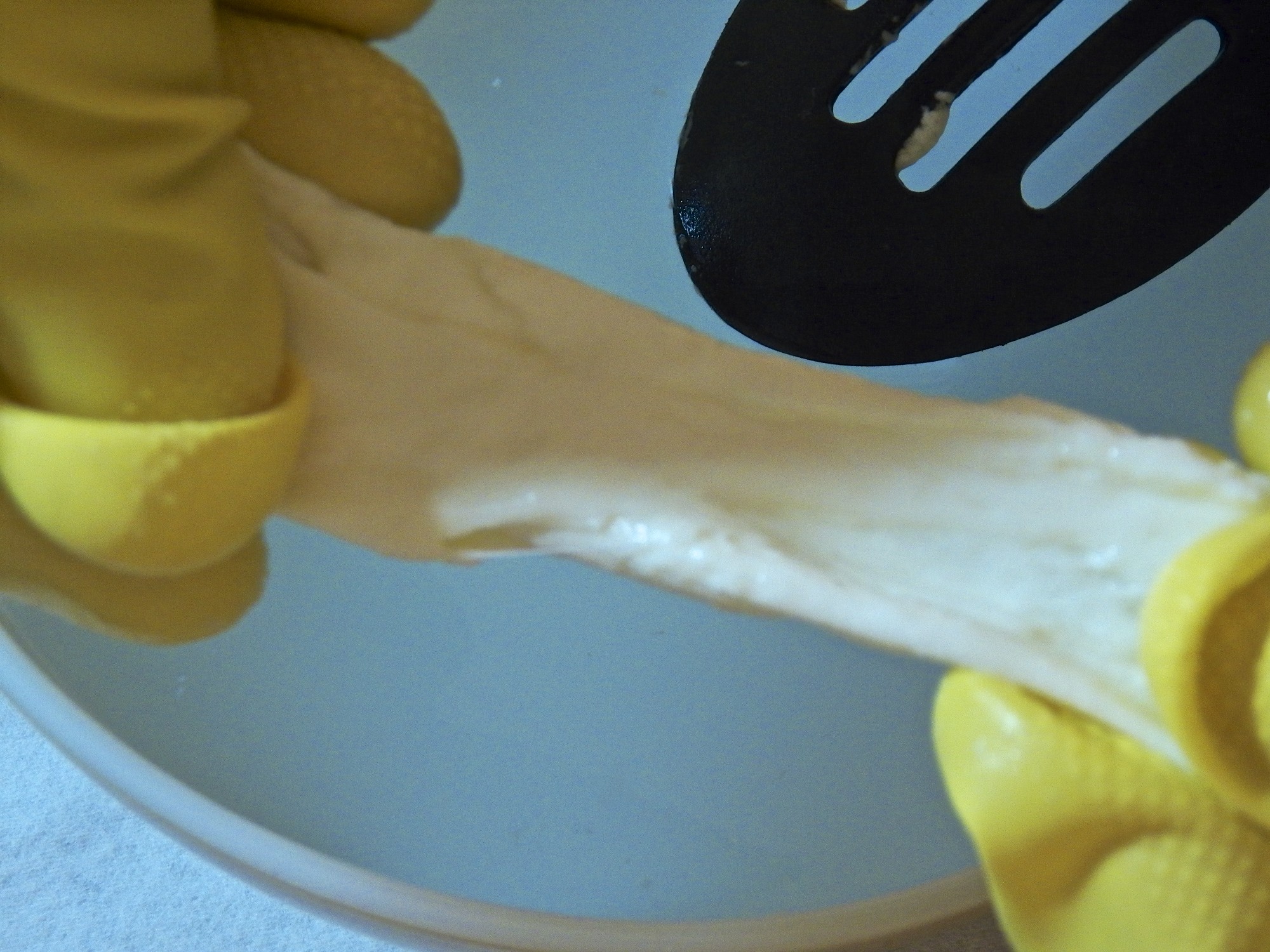 Sorry about the quality of the photos to follow but this wasn’t an easy process to photograph while working alone and wearing gloves. If you have asbestos fingers, you may not need to wear gloves but I’ve found that they offer some protection from the heated curds. I’ve heard that it is customary for women in Italy to keep a bowl of ice water nearby. They dip their hands in it when the heat becomes too much to bear while they’re stretching the mozzarella. It’s not such a bad idea, even when wearing gloves.