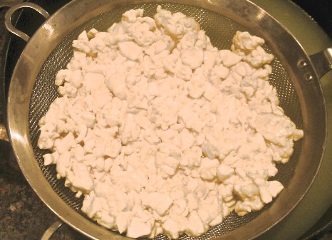 4. 15 – 20 minutes later, use a small sieve or slotted spoon to remove the floating curds and place them in a cheesecloth-lined colander to drain.  Place colander over a bowl in refrigerator and drain for at least a couple of hours or overnight.  The longer you allow it to drain, the more firm the results.