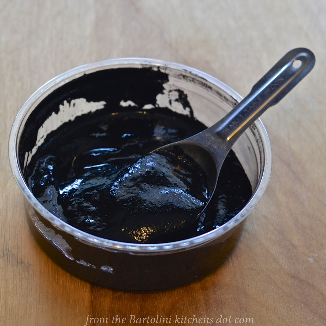 This all changed about 3 months ago. Armed with a gift card given to me by Cynthia and Nigel for my last birthday, I went shopping at Chicago’s newest Italian market. (Cynthia Squid Inkand Nigel are the friends with whom I shared the flats in Florence and Rome.) As I passed the fresh pasta counter, I noticed they were selling black pasta. Upon asking, the clerk directed me to the fishmongers and, lo and behold, they had squid ink! Not only that but they had 2 kinds: 1, a large jar of thick paste, and, the other, a much thinner liquid, in packaging that would remind you of those ubiquitous soy sauce packets found at the bottom of every bag of Chinese take-away. After the fishmonger assured me that it would “last forever”, I bought the paste, thinking I could better control the amount used. On the way home, I decided that this would be the dish I would serve Zia for our Christmas dinner.