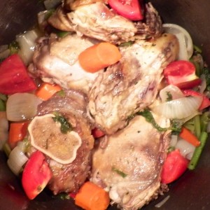 - When the last of the meat has been browned, return the vegetables to the pot, add the garlic, tomato, parsley, and enough water to cover all the pan’s contents by 3 inches, at least.